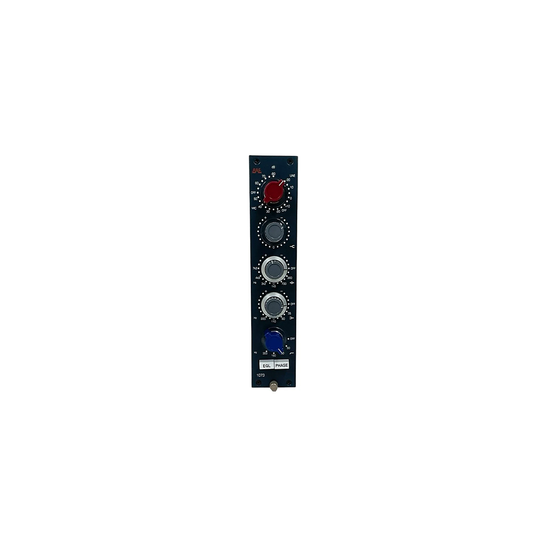 The BAE 1073 Module is a high-end, hand-wired microphone preamp with a 3-band equalizer, designed to capture the iconic sound of the classic 1073 console. Featuring Carnhill transformers, Elma switches, and Canford wiring, it delivers up to 80 dB of gain with selectable input impedance for a warm, rich low end, clear mids, and airy highs. Its EQ offers versatile shaping: a fixed high-shelf at 12 kHz, mid peaking with selectable frequencies from 0.36–7.2 kHz, low shelving with multiple frequency options, and a switchable 18 dB/oct high-pass filter. Ideal for vocals, instruments, or any source needing vintage-inspired character with precise, musical Class-A performance.