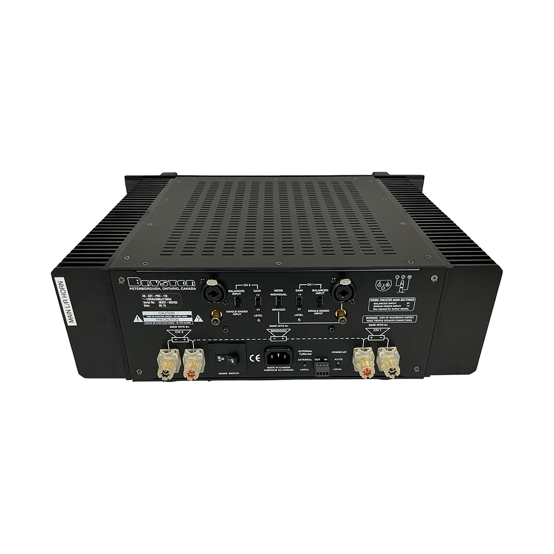 The Bryston 4B SST Pro is a professional-grade stereo power amplifier renowned for its audiophile precision and robust engineering. Delivering 300 watts per channel into 8 ohms in stereo mode—or up to 900 watts into 8 ohms when bridged to mono—it employs a true dual-mono design for maximum channel separation and power integrity. The amplifier offers both balanced (XLR) and single-ended (RCA) inputs, along with selectable gain settings of 29 dB/1 V or 23 dB/2 V, soft-start circuitry to reduce inrush current, and front-mounted level controls for precise calibration. Praised for its effortless power, transparency, and tight control over demanding speaker loads, the 4B SST Pro delivers detailed, dynamic sound that remains clear and composed even at low volumes.