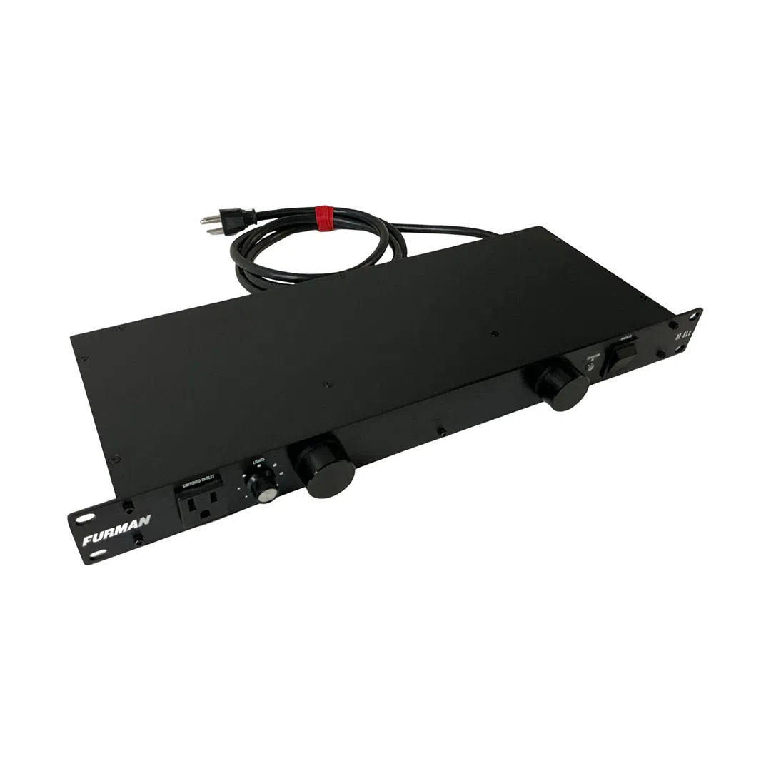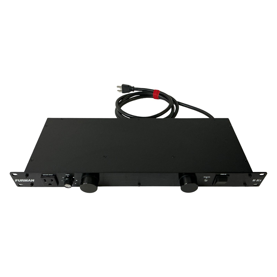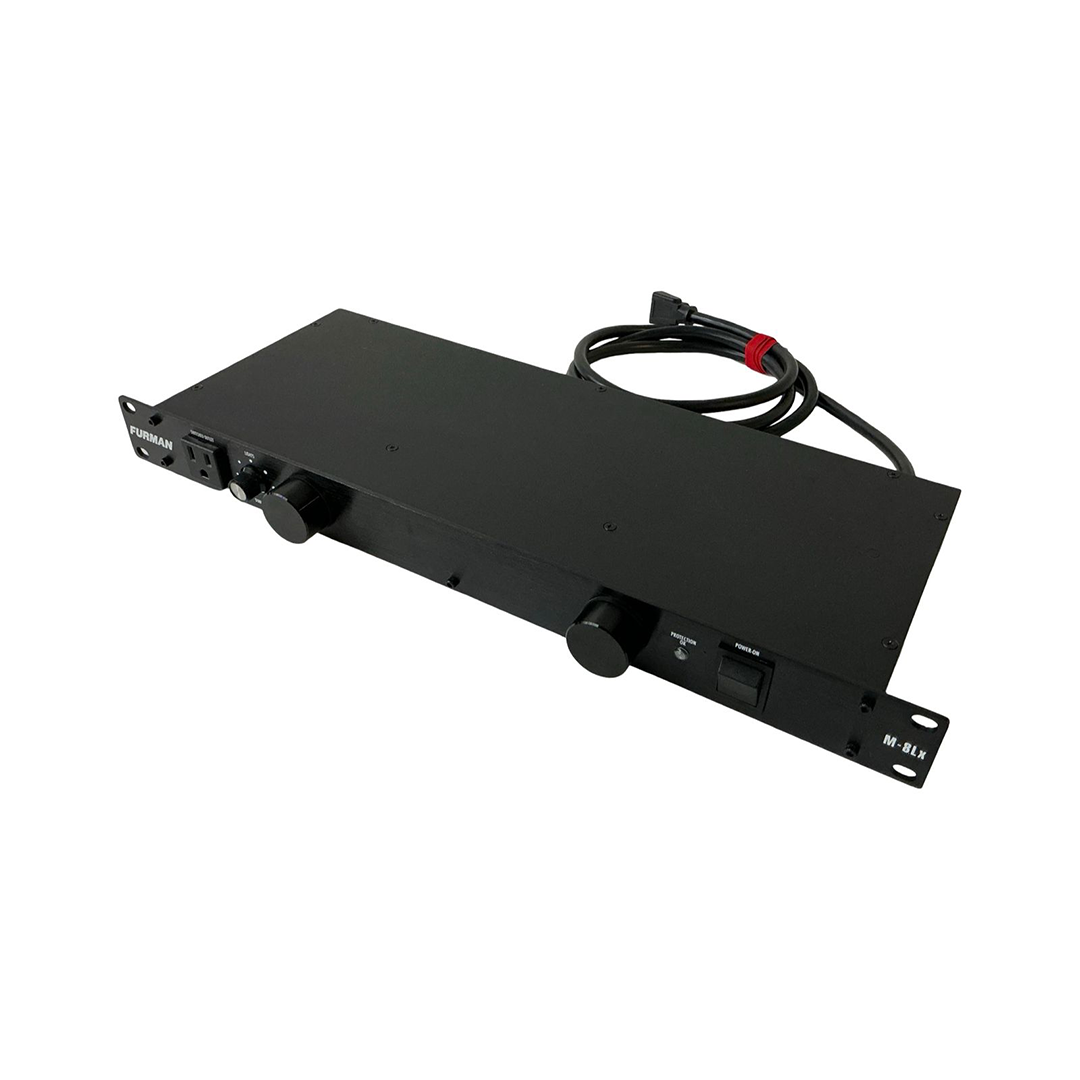 The Furman M-8LX Merit Series Power Conditioner provides reliable power distribution and protection for audio, DJ, and studio equipment. It offers nine outlets (eight on the rear and one on the front), a 15-amp capacity, and built-in surge protection with RFI/EMI filtering to reduce electrical noise and help maintain clean power for connected gear. The unit also features two pull-out rack lights with a dimmer control, making it easier to view equipment in low-light environments. Its sturdy steel chassis makes it a dependable choice for rack-mounted systems.