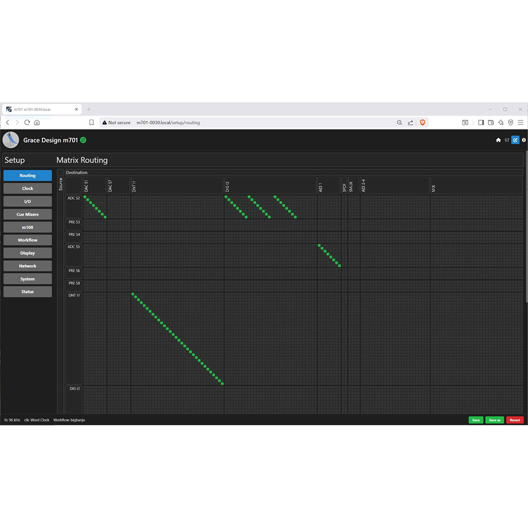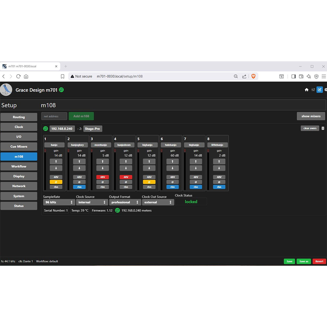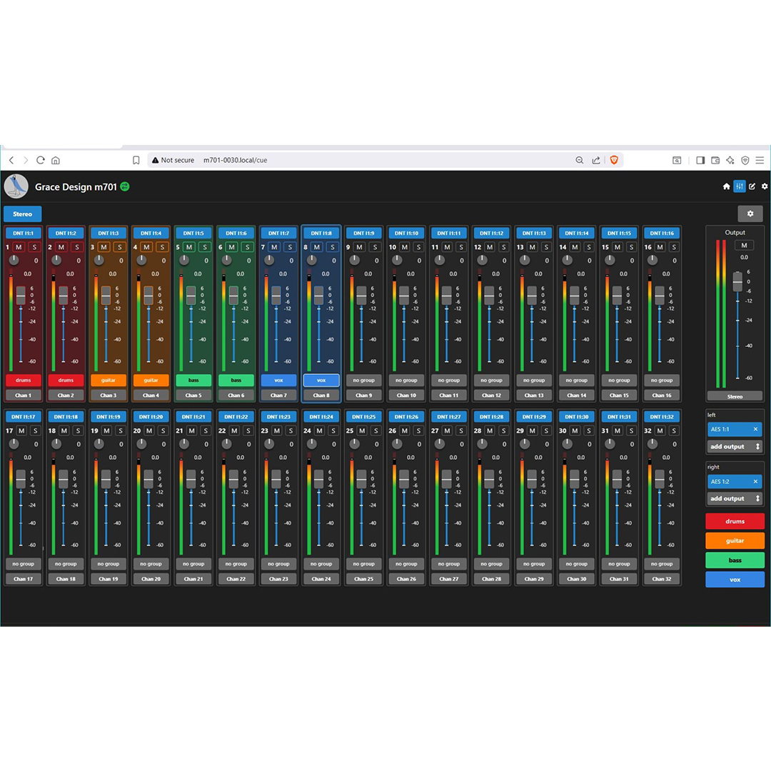 Grace Design’s long-standing expertise in analog circuit design, clocking, and power supply engineering is central to the m701’s performance. While modern converter chips are widely available, the surrounding analog stages are where the m701 distinguishes itself, delivering an open, natural sound that translates accurately across monitoring environments. A built-in 32×8 low-latency cue mixer allows multiple artist headphone mixes to be created and controlled independently, with direct access via GraceNet from phones or tablets.