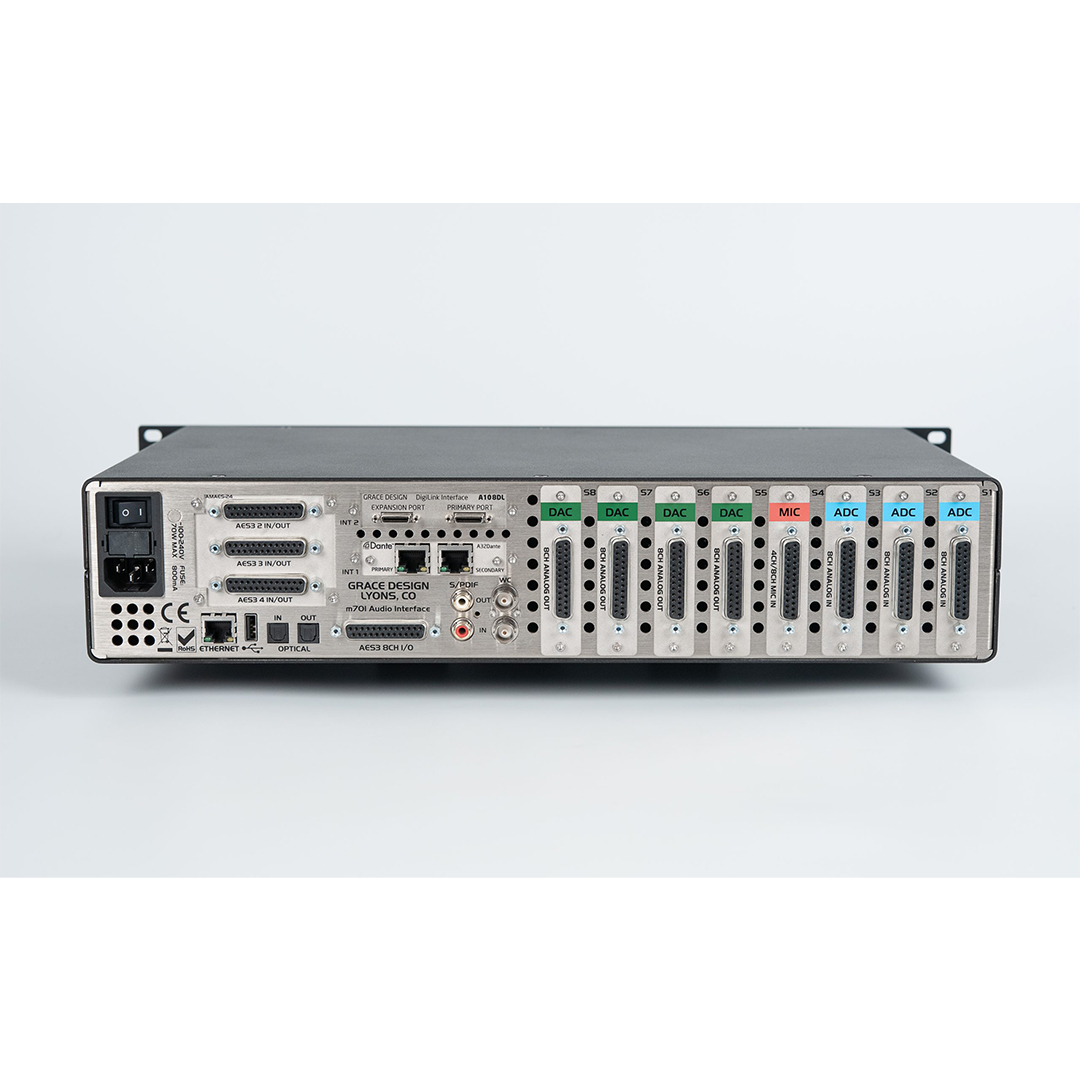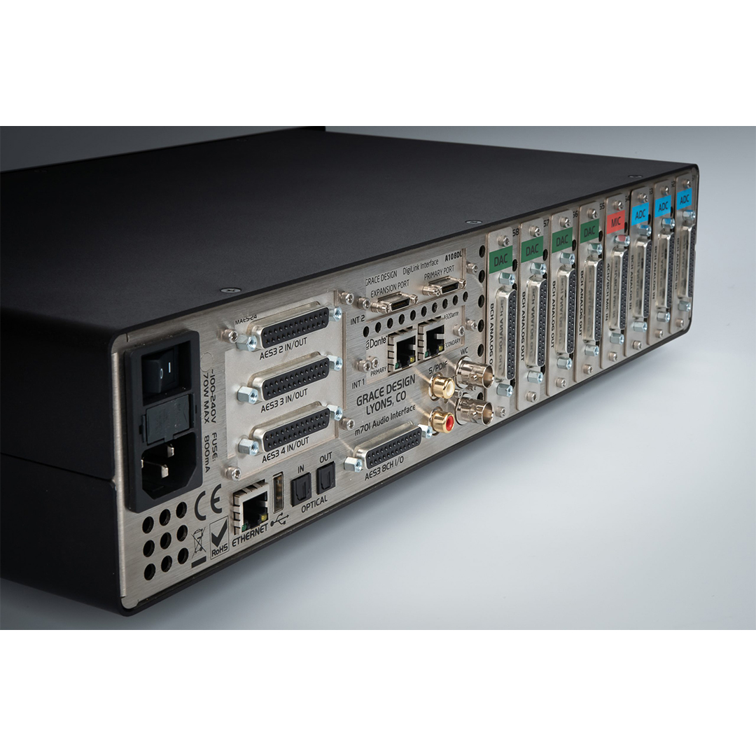 The m701’s modular design allows studios to configure exactly the I/O they need today while remaining adaptable for future expansion. Eight internal card slots support Grace Design’s 8-channel AD and DA modules in any combination, enabling up to 64 channels of analog I/O. The 32×32 USB configuration provides high-channel-count USB connectivity for native DAWs, making it an ideal solution for tracking, mixing, and production environments that rely on USB-based workflows without sacrificing performance or reliability.
