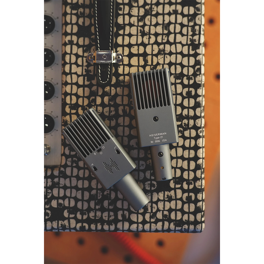 The Type-21 is engineered to handle whatever a modern session can throw at it, pairing studio-grade sonics with road-ready durability. A softly glowing Heiserman logo isn’t just for aesthetics – it is a functional part of the circuit and a visual cue that the mic is ready to work. Switchable polar patterns (cardioid, omni, and figure-8), a high-pass filter, and a -15 dB pad give engineers precise control at the source, whether taming low-end buildup or managing high-SPL instruments.