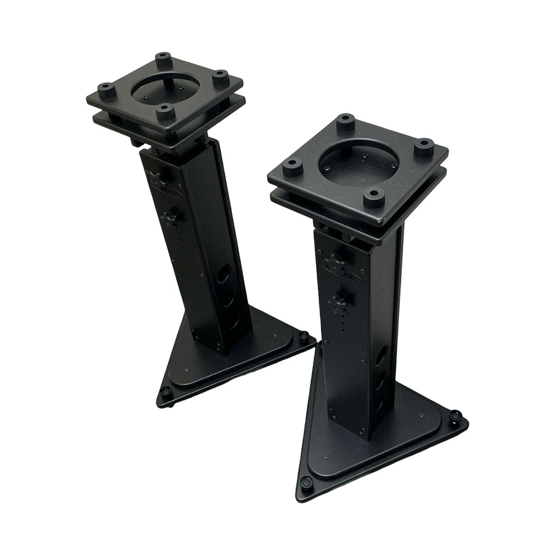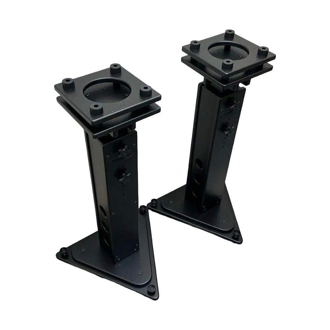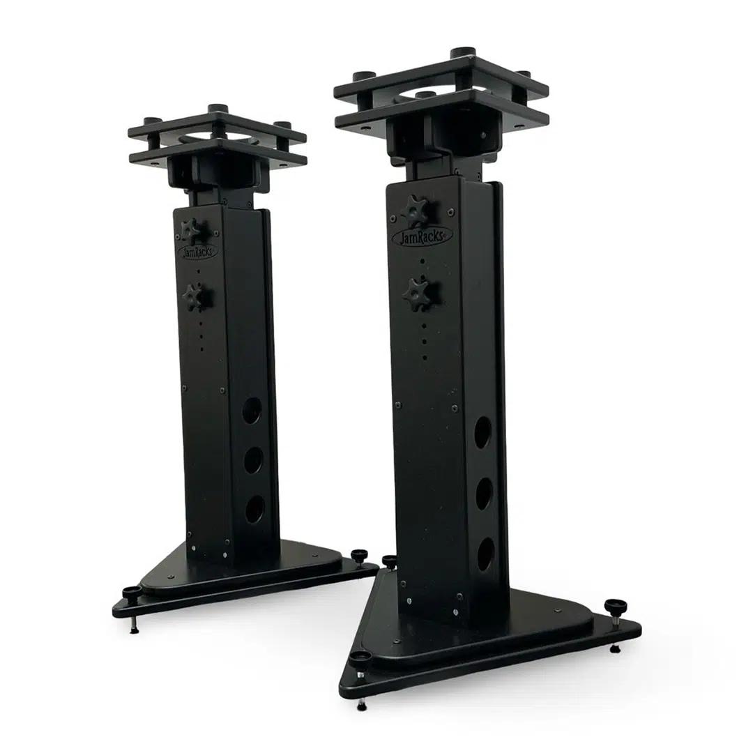 JamRacks® Grand speaker stands are as strong as they are beautiful. Feet adjust for tilt, Top adjusts from 36″ to 42″. Top plate is isolated from base, with cable management in the center. Triangle base is 21″x21″x21″ heavy duty enough to hold 125 lbs. (Tipping factor for heavy speakers will depend on size of speaker box)