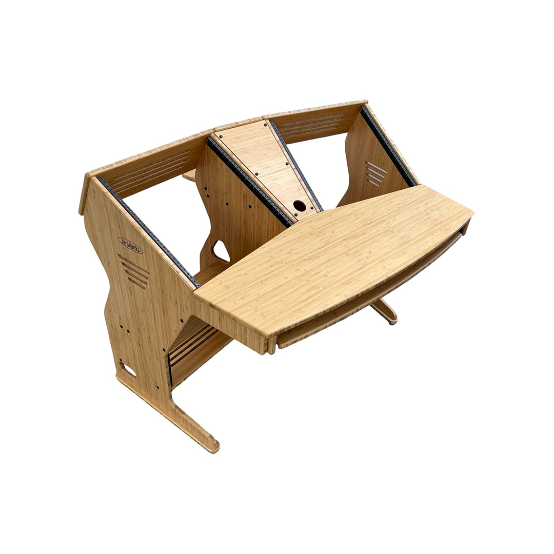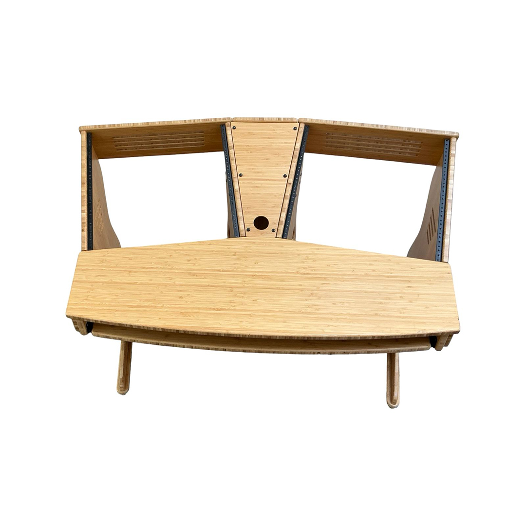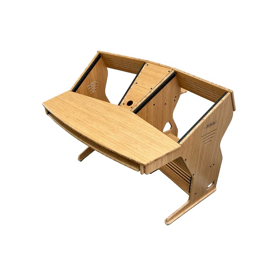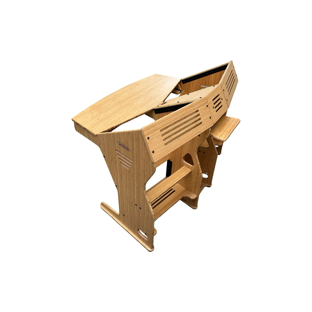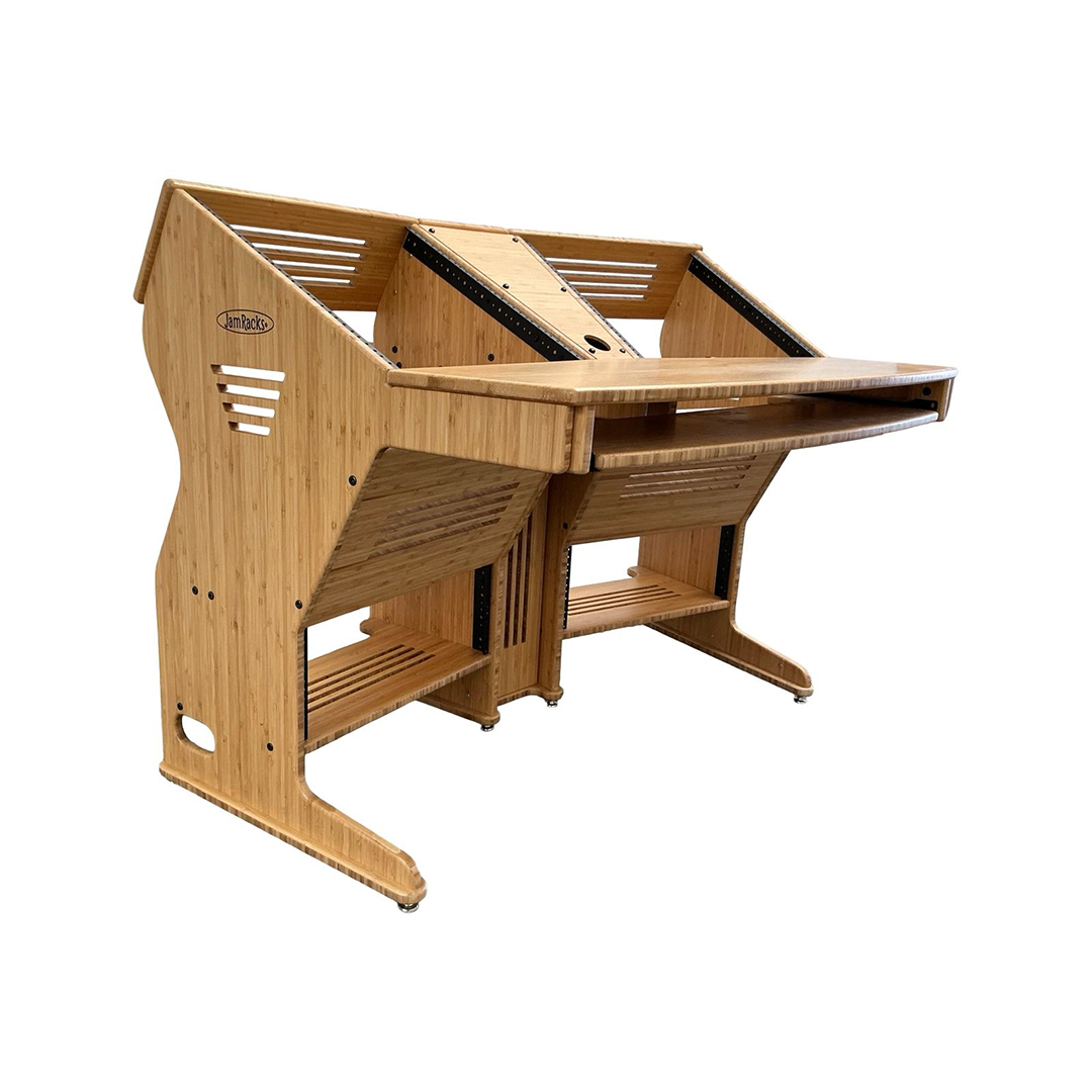 The JamRacks Vdesk is a super compact design great for home recording and mastering studios. A monitor arm can be mounted to the back shelf. Super compact and so strong you can carry it across the room fully loaded. Dimensions: W-53″ x D-39″ x H-28-1/4″ to work top. 37-1/4″ to top of racks. NOW COMES WITH SLIDE OUT TRAY INCLUDED!