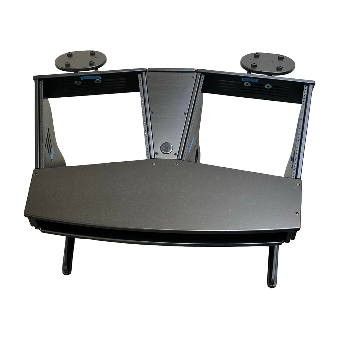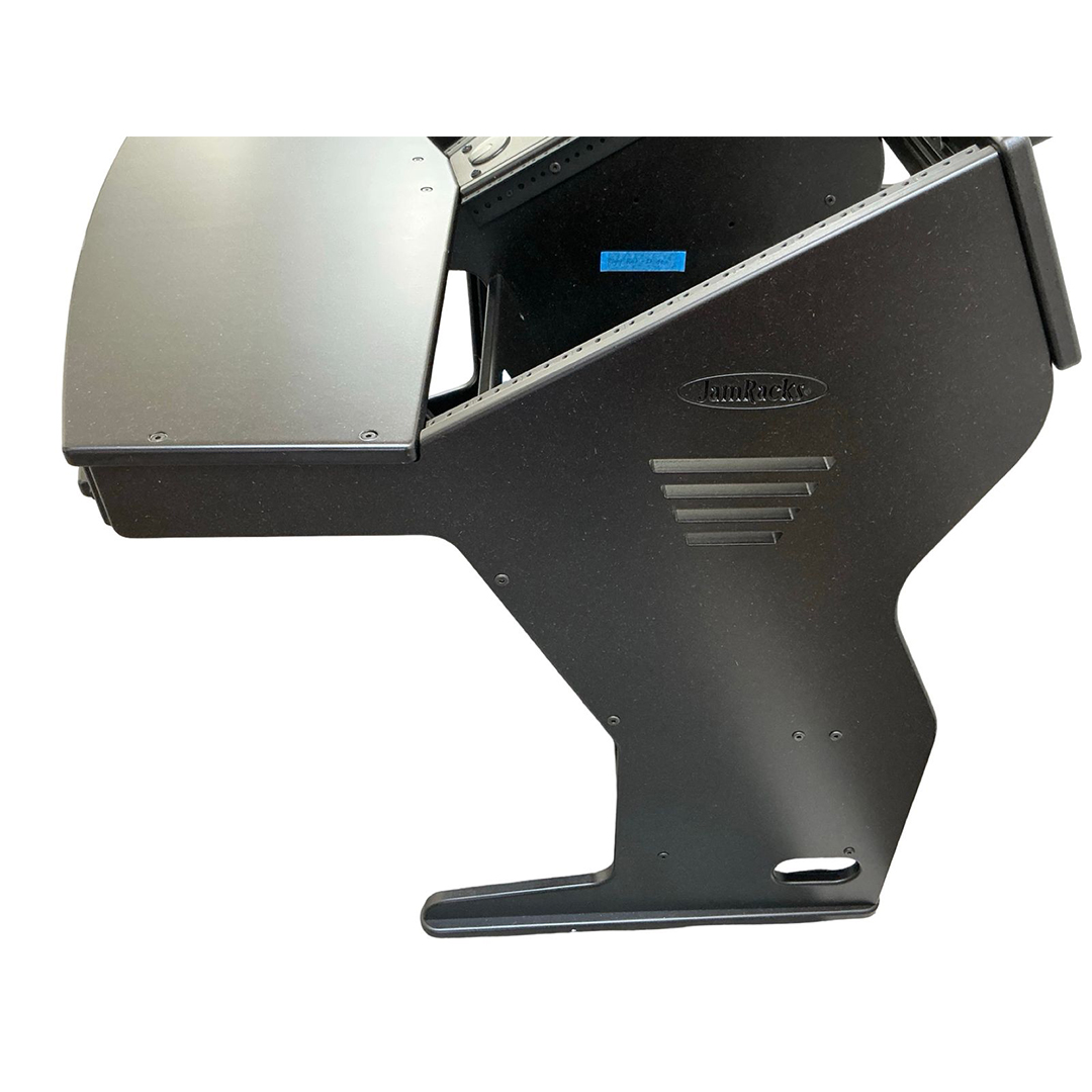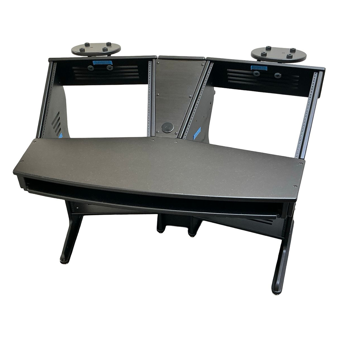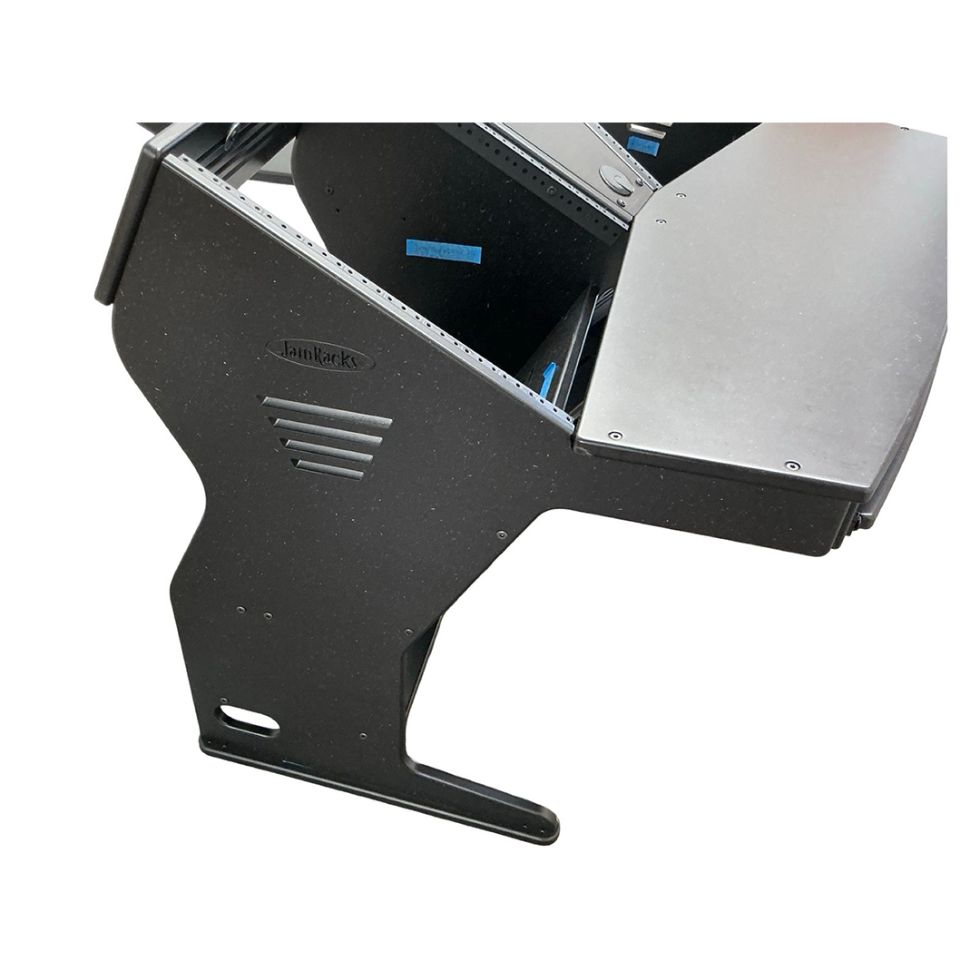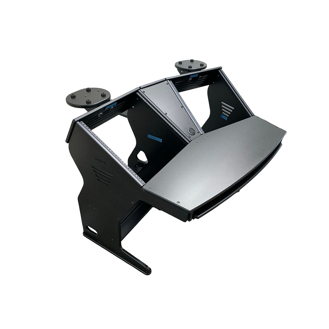 The JamRacks Vdesk is a super compact design great for home recording and mastering studios. A monitor arm can be mounted to the back shelf. Super compact and so strong you can carry it across the room fully loaded. Dimensions: W-53″ x D-39″ x H-28-1/4″ to work top. 37-1/4″ to top of racks. NOW COMES WITH SLIDE OUT TRAY INCLUDED!