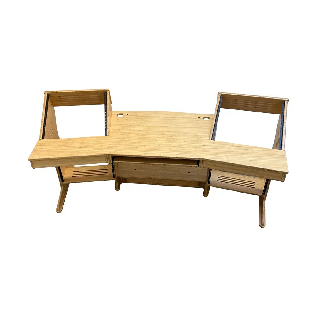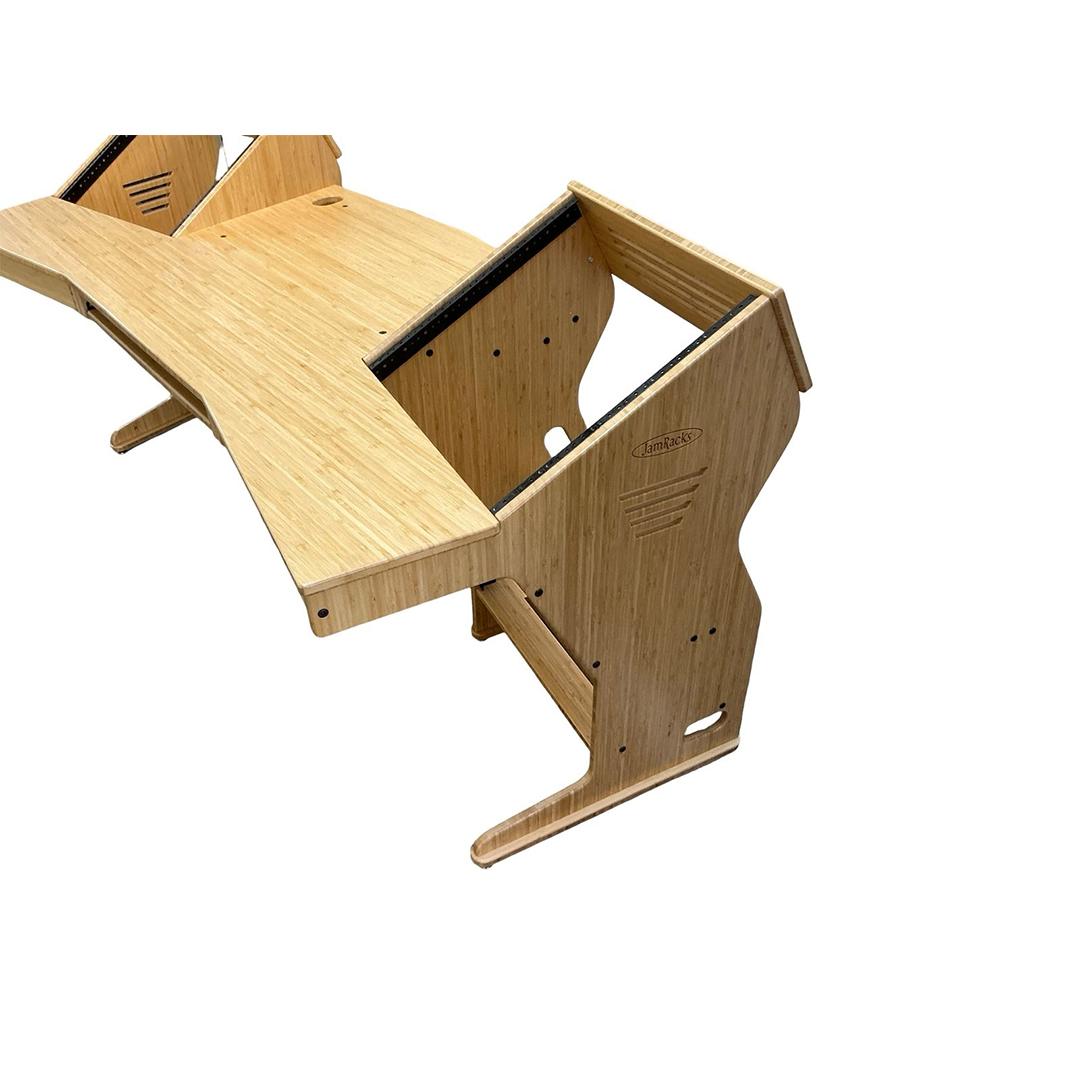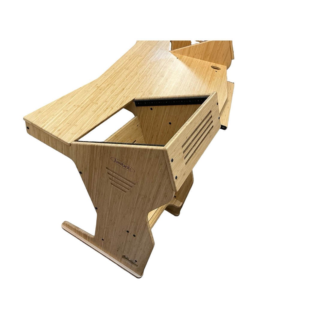 The JamRacks Wing Desk is the perfect production desk with room for small mixers. It features a front slide out tray for a computer keyboard and mouse, and a rear slide out tray for a monitor or mounted monitor arm. Each rack bay provides 10 spaces up and 4 spaces down, totaling 28 rack spaces. Dimensions: W-79″ x D-34-1/4″ x H-28-1/4″ to work top, 37-1/4″ to top of racks. There is 30″ of space between the front corners of the upper racks.