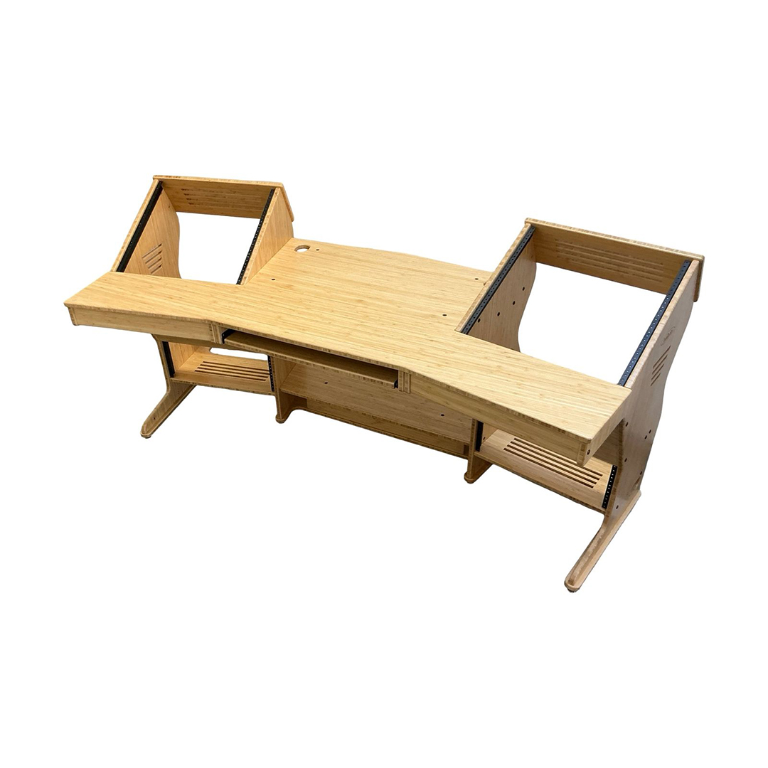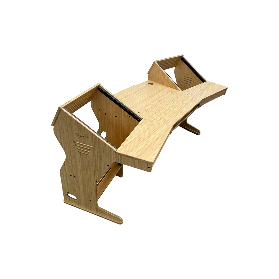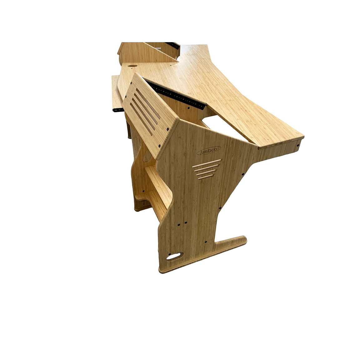 The JamRacks Wing Desk is the perfect production desk with room for small mixers. It features a front slide out tray for a computer keyboard and mouse, and a rear slide out tray for a monitor or mounted monitor arm. Each rack bay provides 10 spaces up and 4 spaces down, totaling 28 rack spaces. Dimensions: W-79″ x D-34-1/4″ x H-28-1/4″ to work top, 37-1/4″ to top of racks. There is 30″ of space between the front corners of the upper racks.