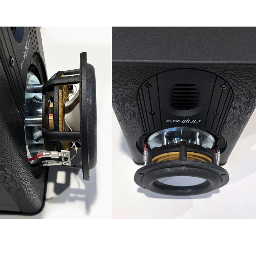 Industry first series crossover with frequency, phase, and distortion correction using the highest quality parts plus a fast and huge excursion driver gives a sound that’s accurate and natural in a tiny box.