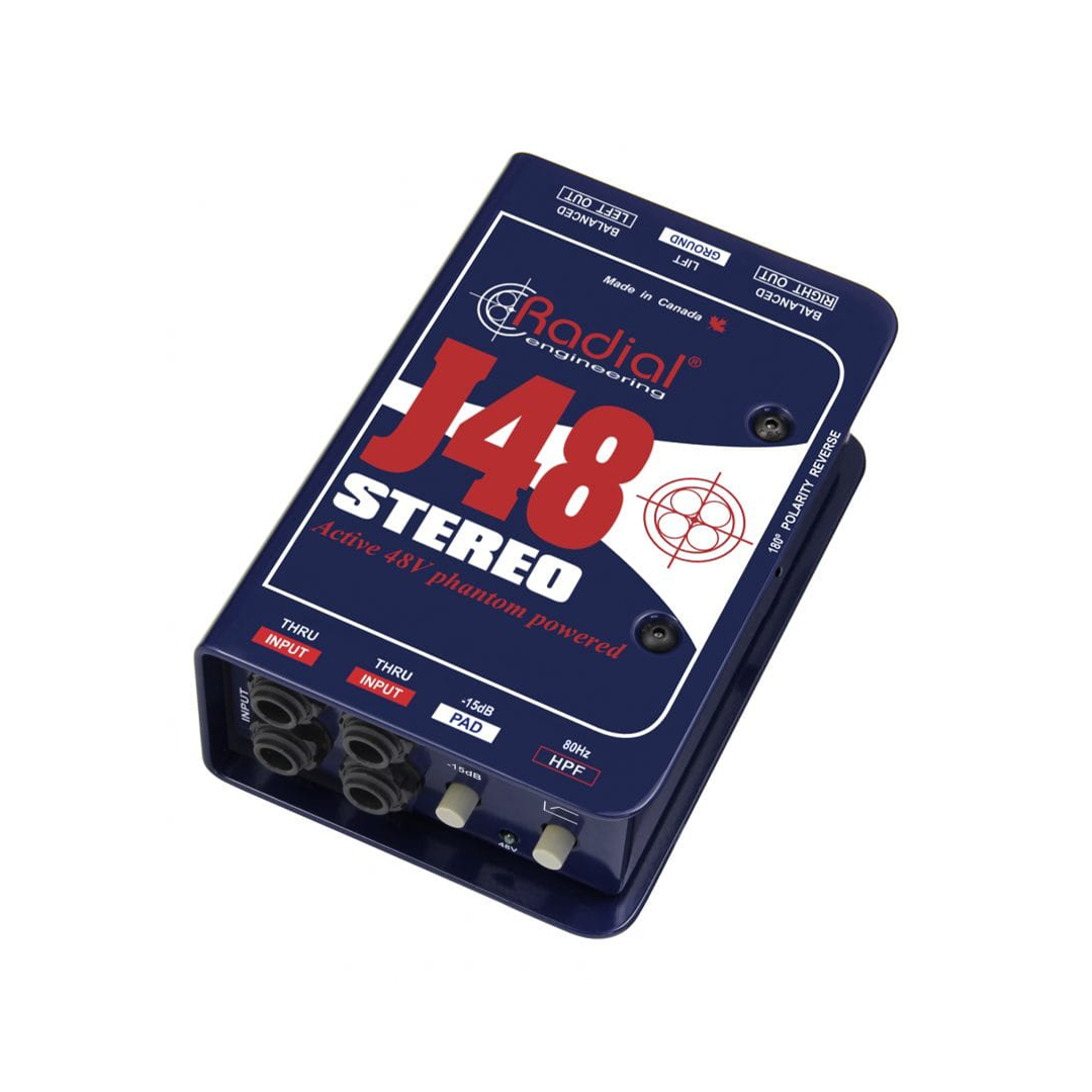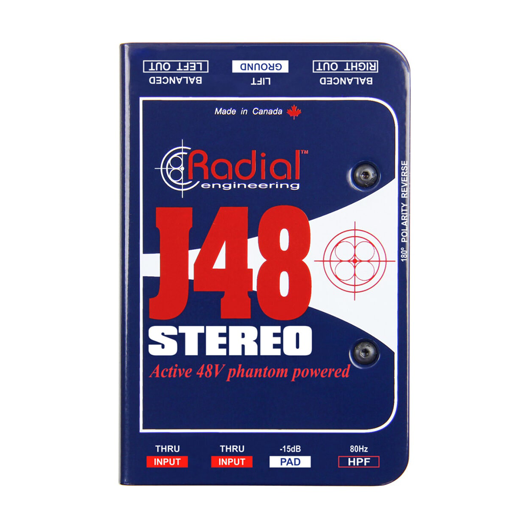 The J48 Stereo is a high-performance two-channel active direct box engineered for live concert touring and professional recording studio applications. Unlike typical active DIs that overload at 3 volts, the J48 Stereo employs a unique switching power supply that raises internal rail voltage to handle up to 9 volts, providing exceptional headroom for battery-powered instruments and stereo keyboards that can produce 7 volts at maximum output. This additional headroom significantly reduces distortion of all types, allowing the natural tone and character of instruments to pass through unaltered. Powered exclusively by 48V phantom (no batteries required), the J48 Stereo maintains excellent stereo separation and low crosstalk between left and right channels, making it equally suited for stereo sources like keyboards or dual mono applications with two separate instruments. A built-in pad reduces sensitivity when needed, while the compact design delivers sound quality rivaling DIs costing five times as much.