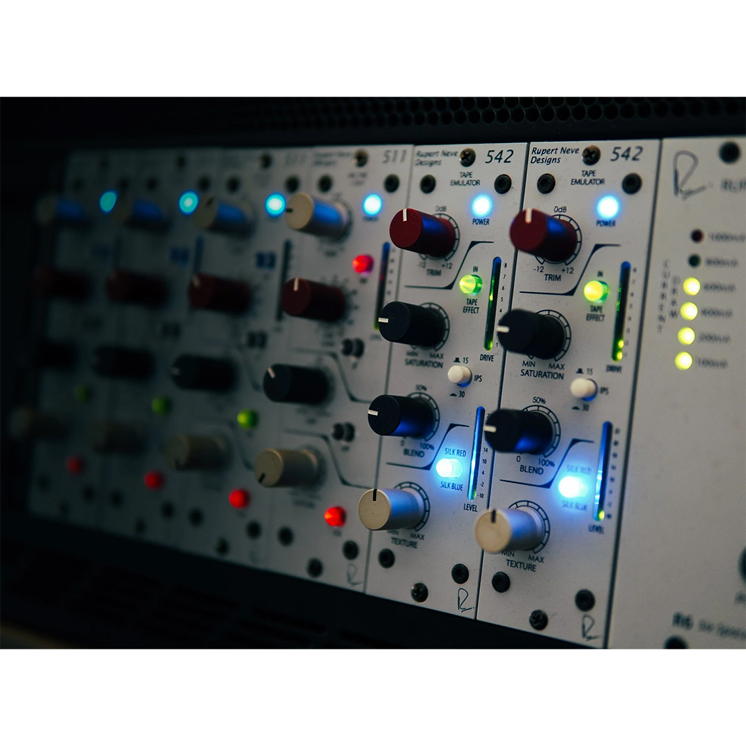 Variable Saturation and Blend: The continuously variable Saturation control drives the “record head” circuit to increase harmonic content. Rupert Neve Designs included a Blend control to allow for parallel processing, letting the engineer mix the processed tape signal with the dry original to maintain transient detail.