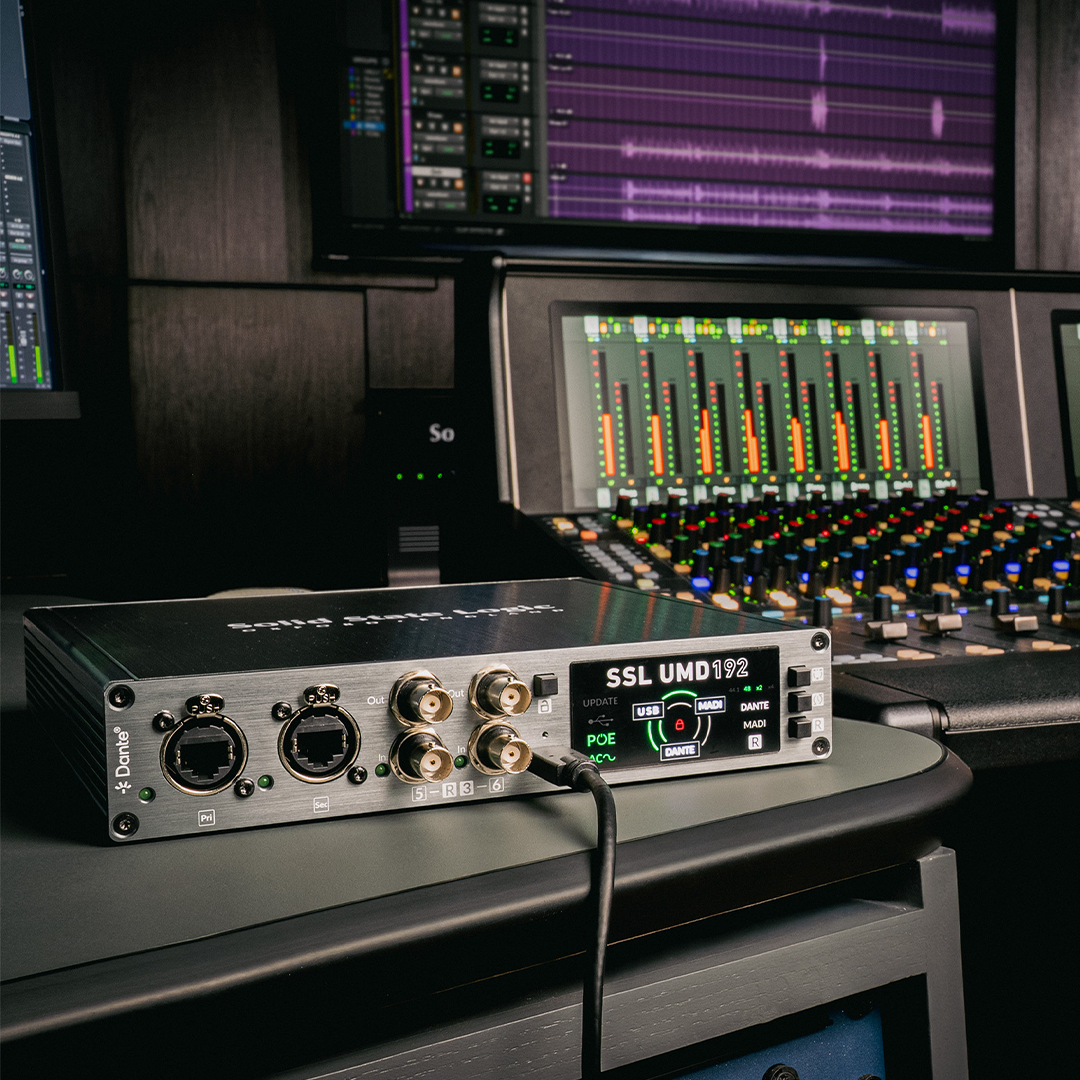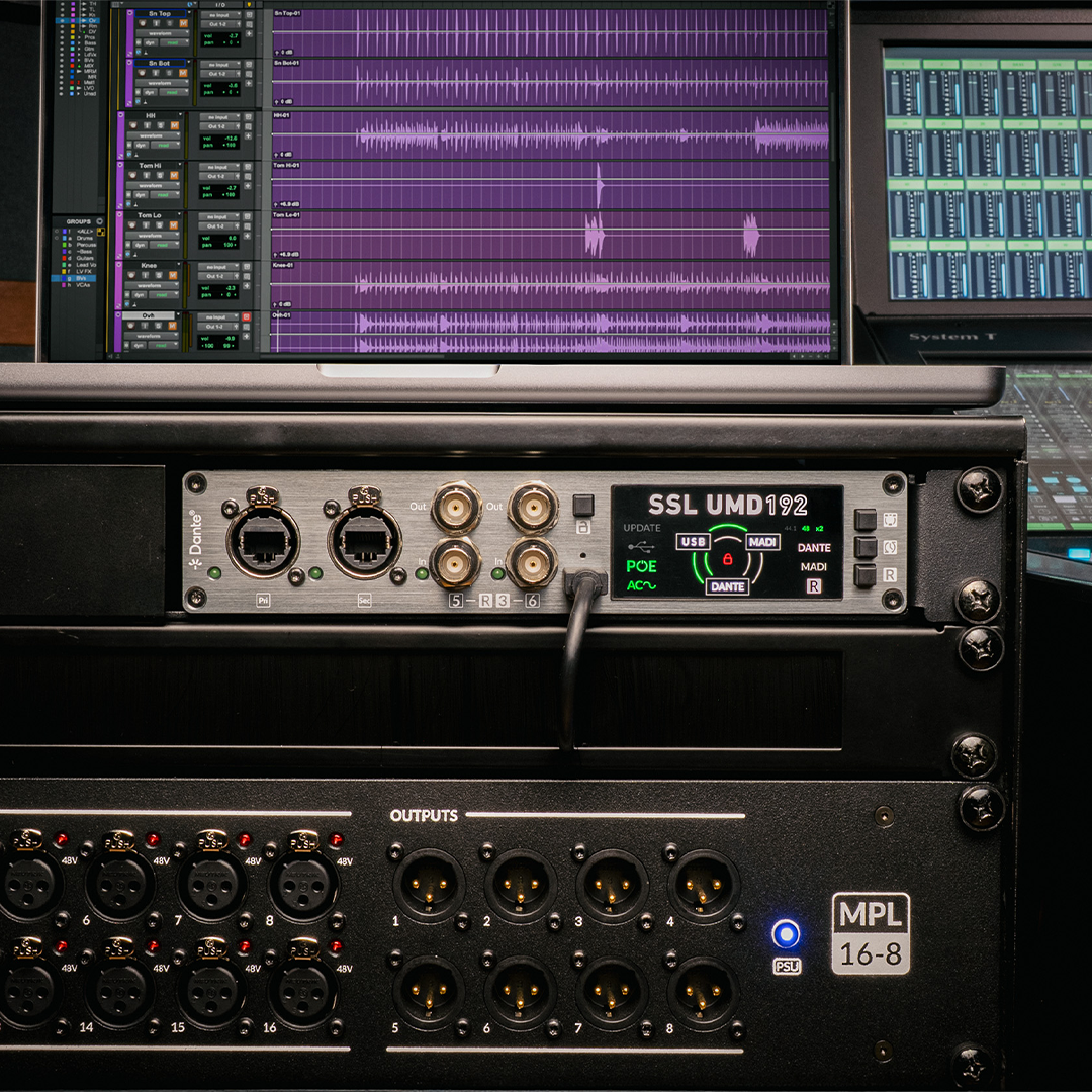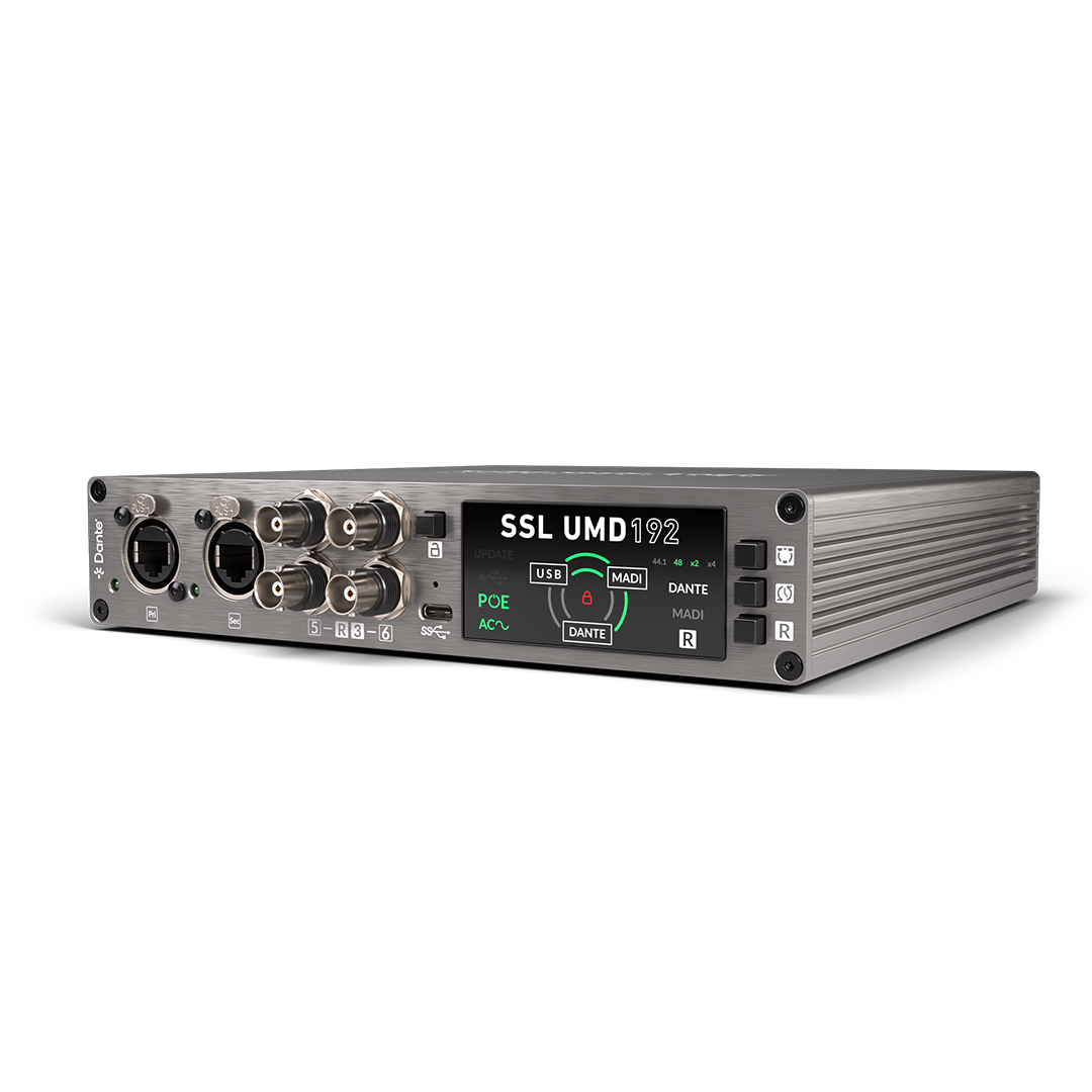The UMD192 delivers 192 channels of professional audio routing in a compact half-rack form factor. Designed for live sound, broadcast, and high-specification studio environments, this USB 3.0 interface bridges MADI, Dante, and USB with bidirectional audio between any two formats and split feed capability to the third. Six MADI BNC pairs support standard or redundant mode (three dual-redundant connections for mission-critical workflows), while fully interoperable Dante AoIP includes AES67 and ST 2110 support with ultra-low latency down to 0.25ms. Flexible clocking from MADI or Dante covers 44.1kHz to 192kHz sample rates, and multiple power options (AC, PoE, USB) enable redundant supply configurations. Class-compliant on macOS with ASIO driver support for Windows, the UMD192 integrates seamlessly with SSL System T, Oracle, and ORIGIN installations, Harrison 32Classic systems, or any professional setup requiring high-channel-count recording, playback, and format conversion.