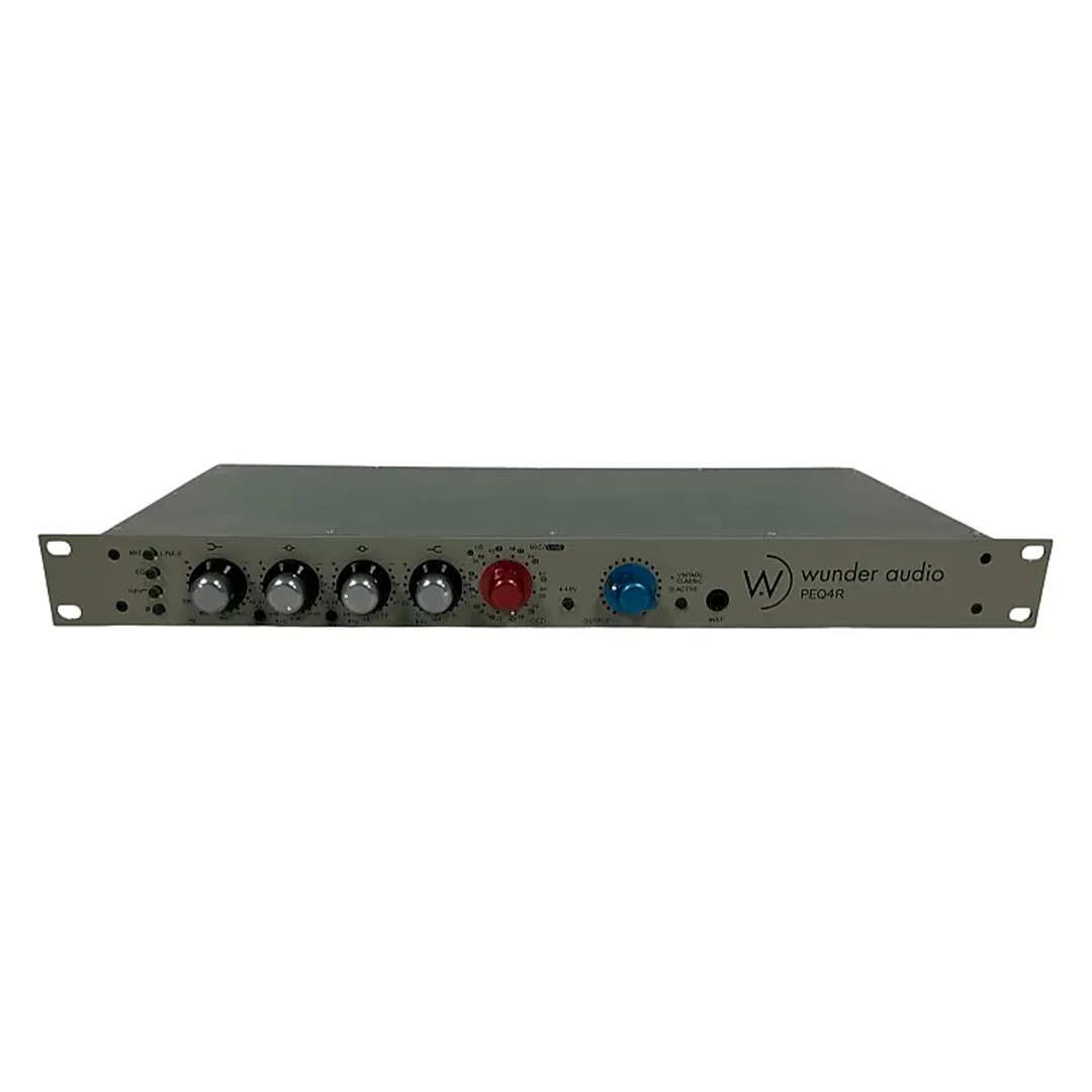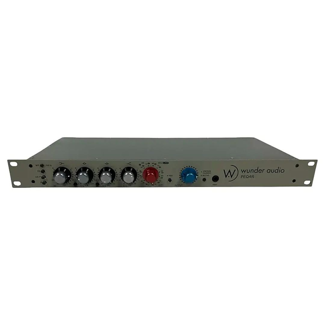 The Wunder Audio PEQ4R is a premium 19” rackmount mic preamp and 4-band equalizer that blends vintage British console tone with modern clarity and control. Each unit features wide and narrow Q selection on the mid bands, Class-A circuitry, custom nickel/iron/cobalt transformers, and precision relay switching. As a matched pair, the PEQ4R delivers up to 78 dB of clean gain, rich harmonic detail, and versatile EQ shaping—making it a powerful tool for professional tracking, mixing, or mastering.